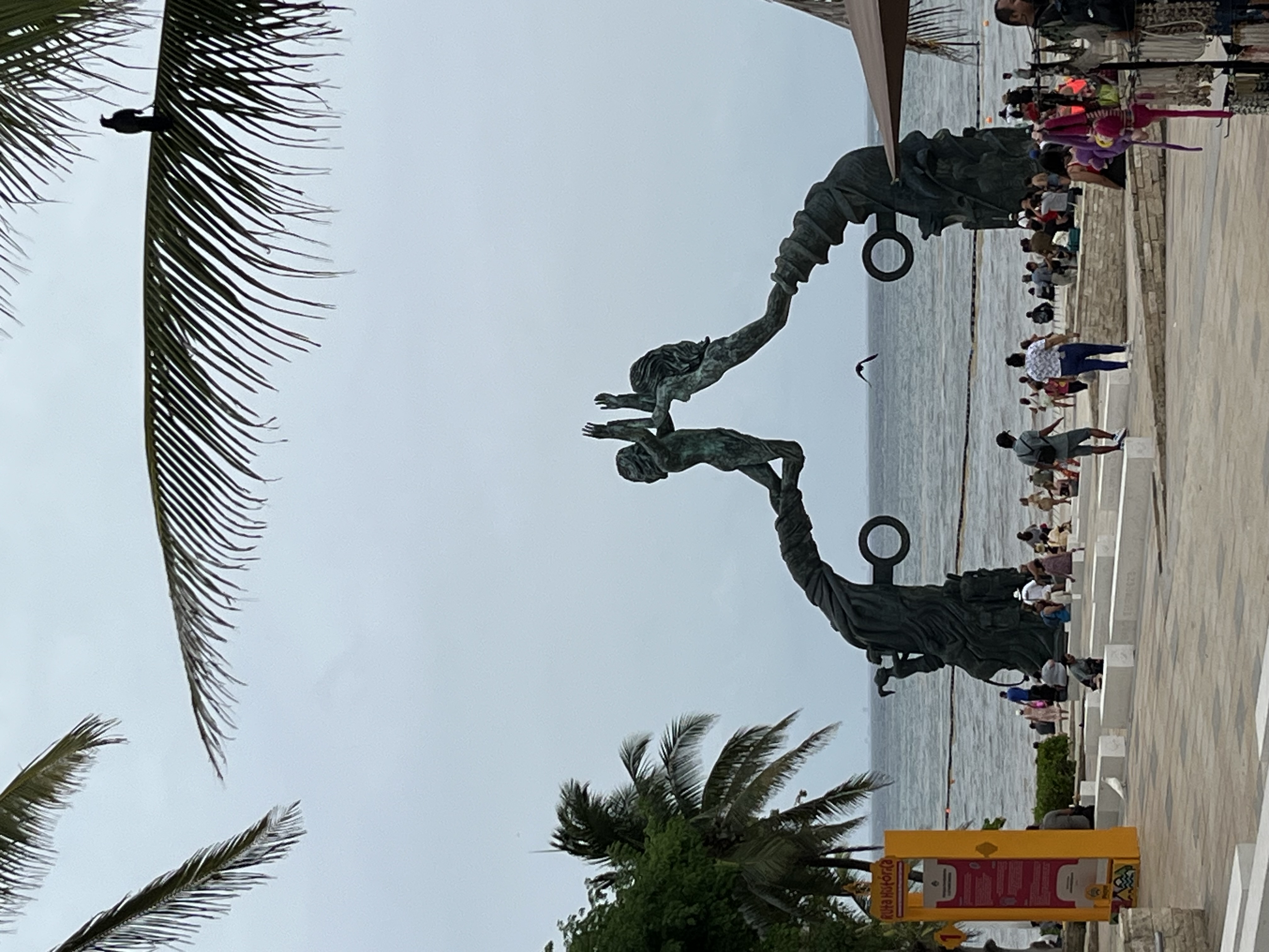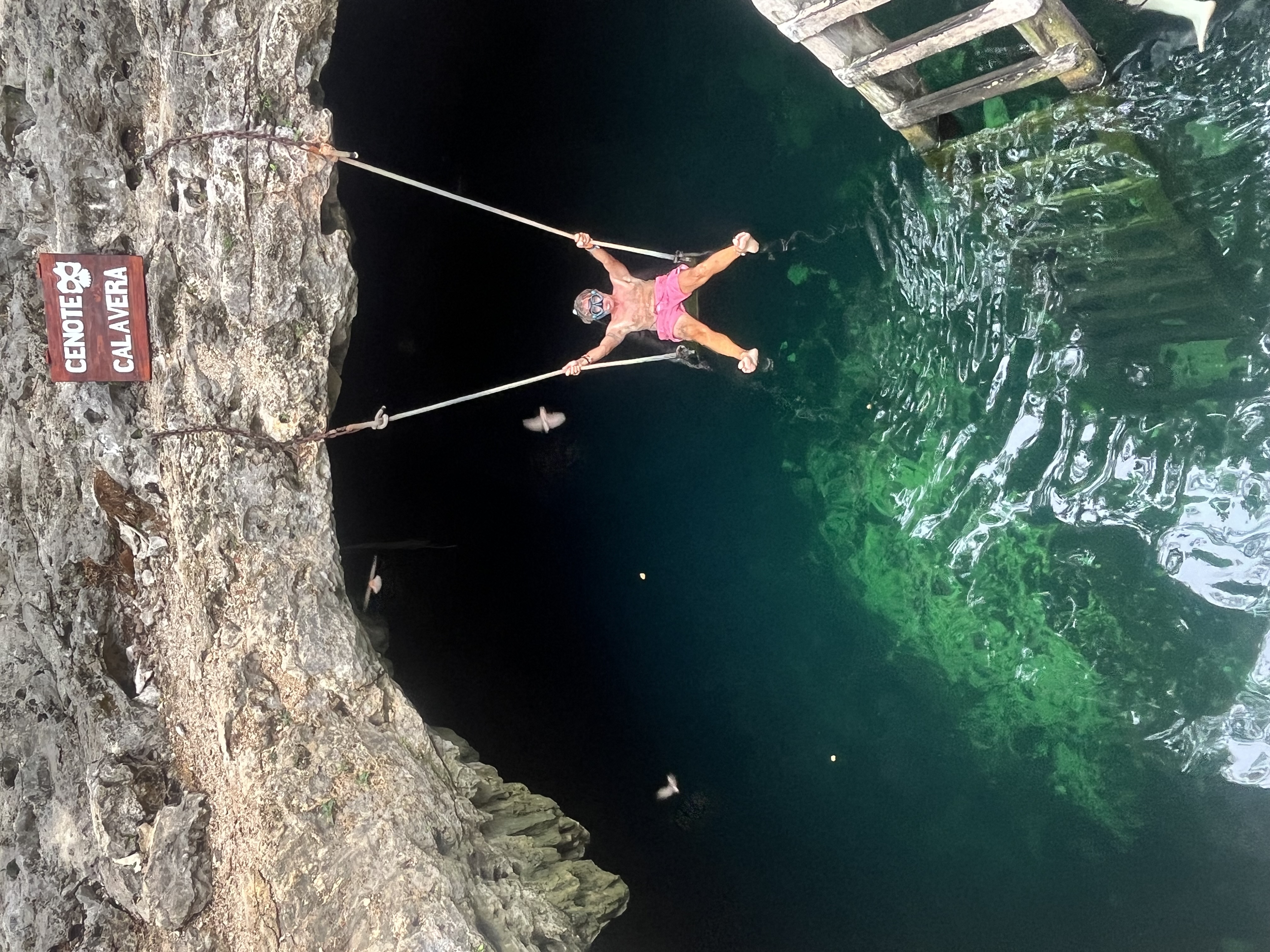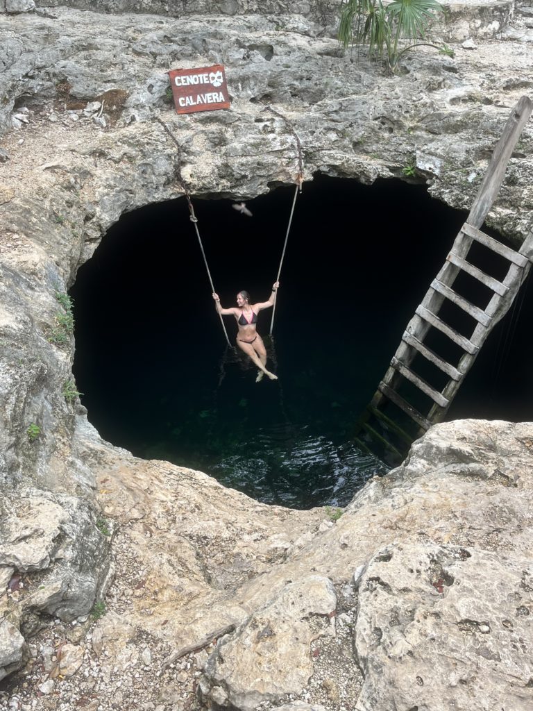 Ce matin, le temps s’est enfin amélioré; plus de pluie ni de vent! Nous prenons la route pour la ville de Playa del Carmen. En chemin, dernier cenote (pour Leonie), Calavera, qui comme son nom l’indique signifie crâne en espagnol. Ce nom évocateur provient de l’aspect particulier de l’ouverture du cénote vue d’en haut : la voûte effondrée forme trois trous dans la roche, et ensemble, ils ressemblent à un crâne humain, avec deux “yeux” et une “bouche”. Un cenote très photogénique avec sa balançoire et son échelle s’enfonçant dans l’eau.