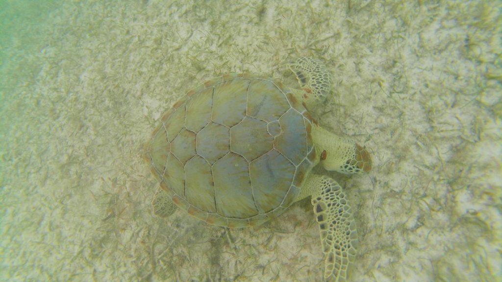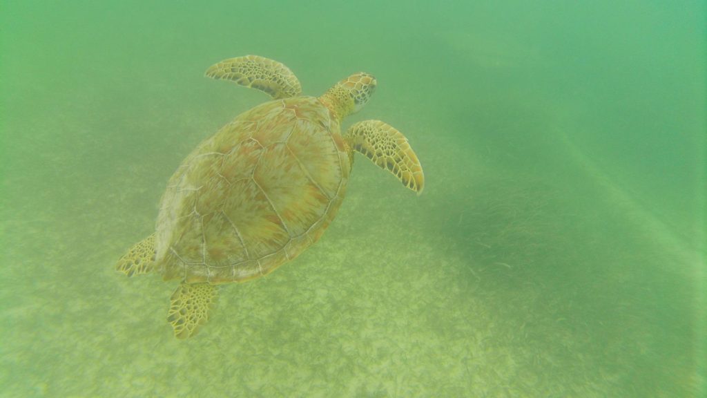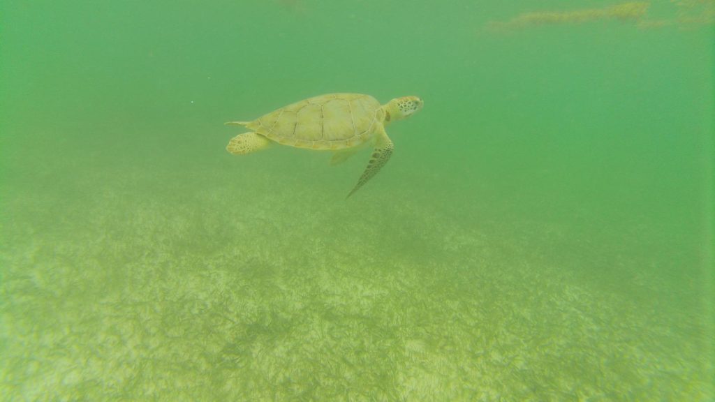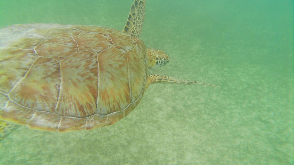 Notre dernière étape, et non des moindres, avant d’arriver à Playa est très controversée entre les 3 capdingues. En effet, nager avec les tortues est une des activités incontournables à faire lors d’une visite dans la péninsule du Yucatan au Mexique. Il existe un petit village nommé Akumal, littéralement «lieu des tortues» en langue Maya ou elles sont présentes en grand nombre grâce à l’herbier marin de la baie, dont elles se nourrissent. Il s’agit sans aucun doute du meilleur endroit pour voir des tortues au Mexique et nager avec ces créatures marines extraordinaires. Autrefois, cette activité était gratuite et totalement libre d’accès, il n’existait aucune limitation. N’importe qui pouvait entrer dans l’eau avec son masque et son tuba et nager avec les tortues d’Akumal. Avec la montée en flèche du tourisme dans cette région du Mexique, la baie d’Akumal était devenu très fréquentée, trop fréquentée. Malheureusement des visiteurs ne respectaient pas les règles de bon sens comme ne pas toucher les tortues ou ne pas toucher les coraux. Pour faire face à cela, la CONANP (La comission des zones protégées du Mexique) a déclarée la zone comme protégée et a mis en place des règles strictes. Un boulversement total dans la manière d’effectuer cette activité qui a pour but de protéger les tortues, et c’est tant mieux ! Désormais un guide fédéral est obligatoire pour réaliser cette activité et l’accès à la plage est désormais payant. S’entame donc une discussion, entre la team pour l’activité dont je suis la seule membre et la team plutôt sceptique!! Je remporte le match, car ça sera les premières tortues que verra Leonie et je suis sûre que ça sera un moment magique même si plus tout à fait pittoresque! J’avais raison d’insister car nous en voyons plein ainsi qu’une raie et des poissons de couleurs sur les récifs coralliens et le guide Carlos est vraiment super et nous laisse profiter un peu en retrait de ce moment.
