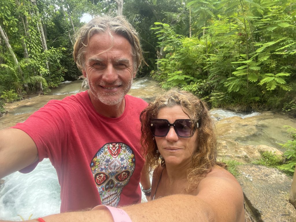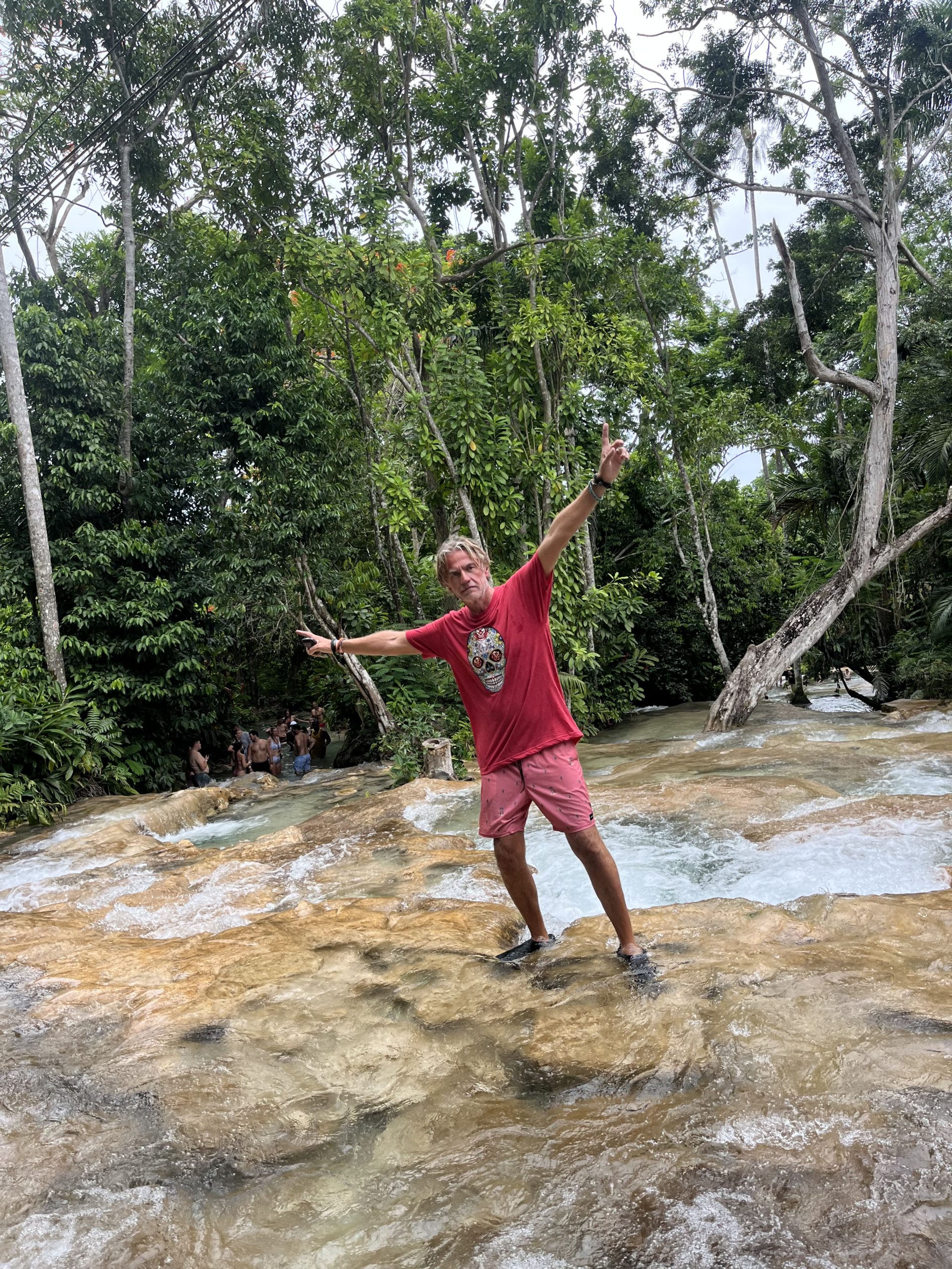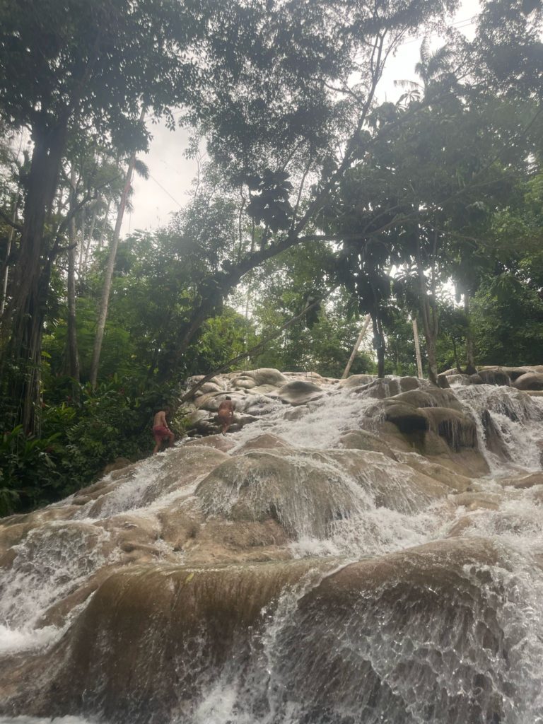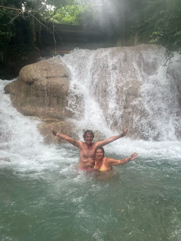 Arrivés sur place, le jeu consiste donc à remonter les chutes en escaladant et bien sûr Pat n’a pas voulu prendre de guide. On y va donc au feeling, en priant pour ne pas glisser 🤣 heureusement que nous sommes arrivés tôt, car quand nous commençons notre montée, des nuées de touristes arrivés en catamaran et en bus monopolisent les bassins qui deviennent subitement moins enchanteurs!!! Ils nous restent ensuite encore une heure de route avant d’arriver à Ocho Rios où se trouve notre nouveau logement. Nous prenons un petit apéro à l’hôtel hibiscus avec vue sur la mer des Caraïbes, avant de nous rendre au resto Évitas. Installé depuis 1984 dans une authentique maison “gingerbread” des années 1860, Evita’s offre un décor pittoresque avec planchers en bois, bar en acajou, et terrasse panoramique sur la baie d’Ocho Rios et les quais. Spécialisé dans la cuisine italienne du nord, avec une touche fusion “Jam‑Italian” inspirée des saveurs jamaïcaines — fruits de mer, viandes.