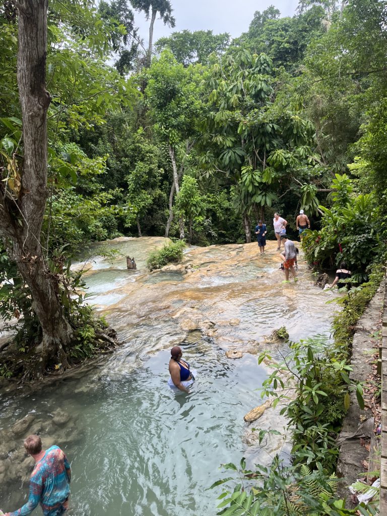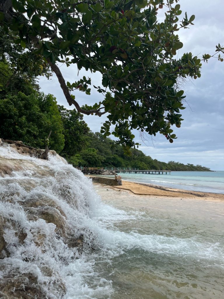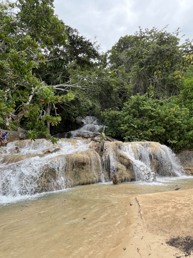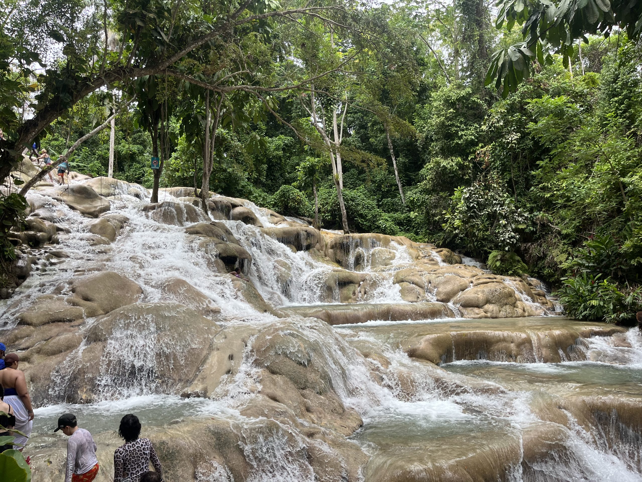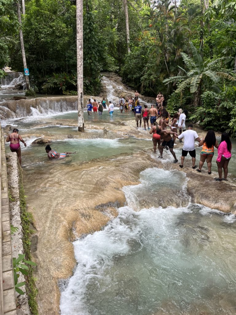 La Jamaïque est bénie avec une abondance d’eau, y compris un certain nombre de cascades et de chutes d’eau. Nous partons donc ce matin, après un pattie (sandwich jamaïcain) en guise de petit dej, visiter la plus célèbre: les chutes de la Dunn (Dunn’s River Falls), près d’Ocho Rios sur la côte nord. Les chutes de la Dunn atteignent 55 mètres de haut, et les roches sont en terrasses comme des marches. Les lagunes sont entrecoupées parmi les roches. Les chutes sont continuellement reconstruites par des dépôts de roches, et les géologues disent de Dunn’s River Falls que c’est un phénomène vivant à cause de cette reconstruction. En plus, les chutes se déversent dans la mer des Caraïbes, ce qui les rend unique. Elles sont sans nul doute l’un des trésors national de la Jamaïque.