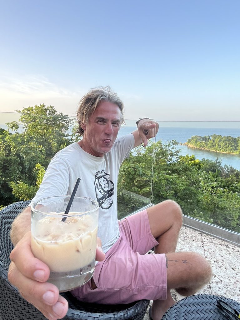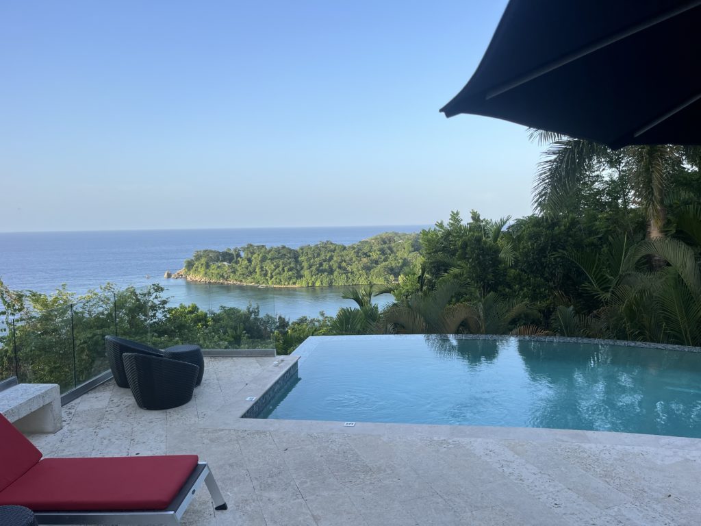 Pour le coucher de soleil, nous nous rendons au bushbar de l’hôtel Geejam avec une piscine à débordement et vue panoramique sur la mer et la jungle. Tout simplement magnifique. On décide d’y dîner. Pat goûte une autre spécialité de l’île, la queue de bœuf.