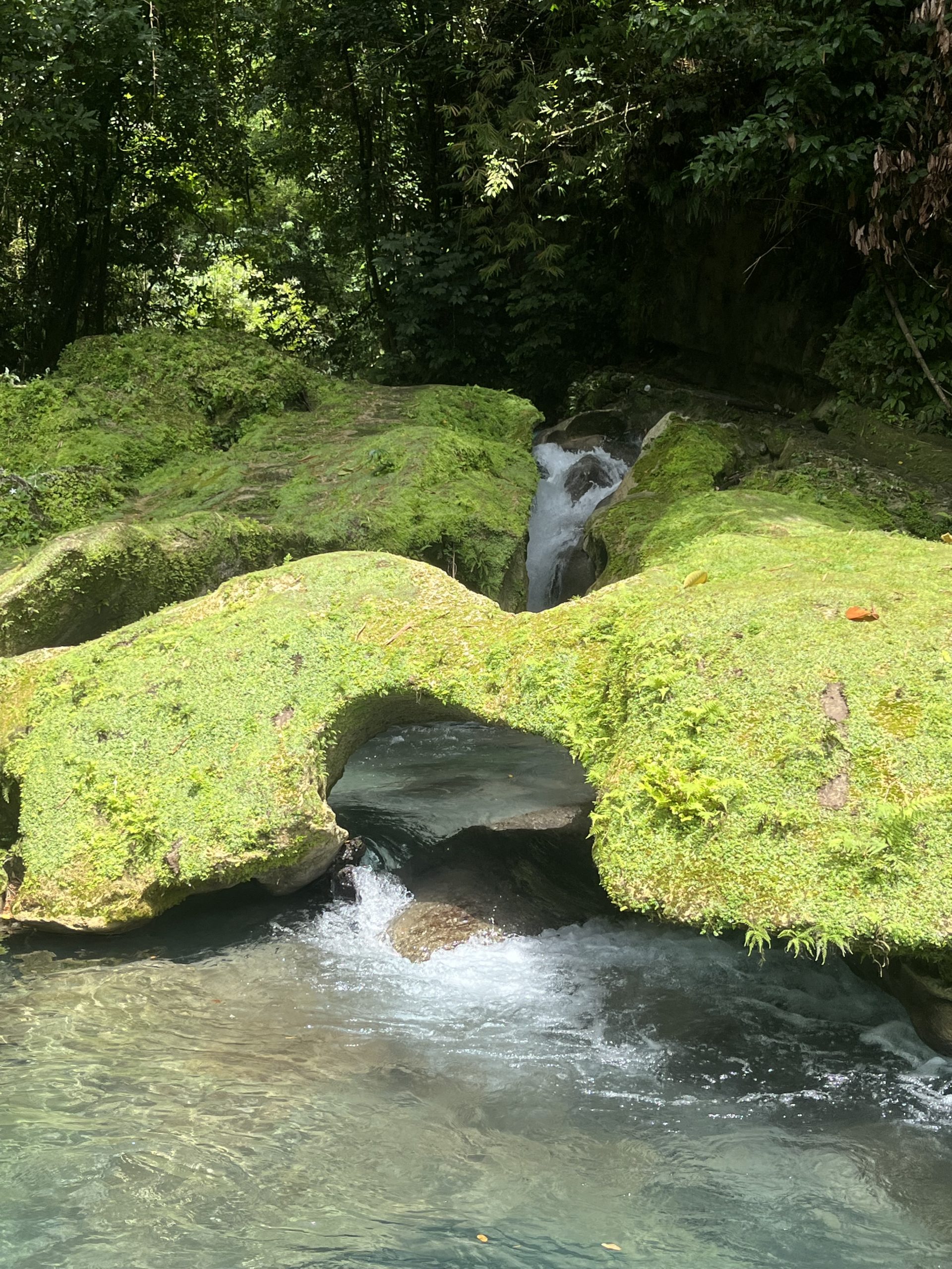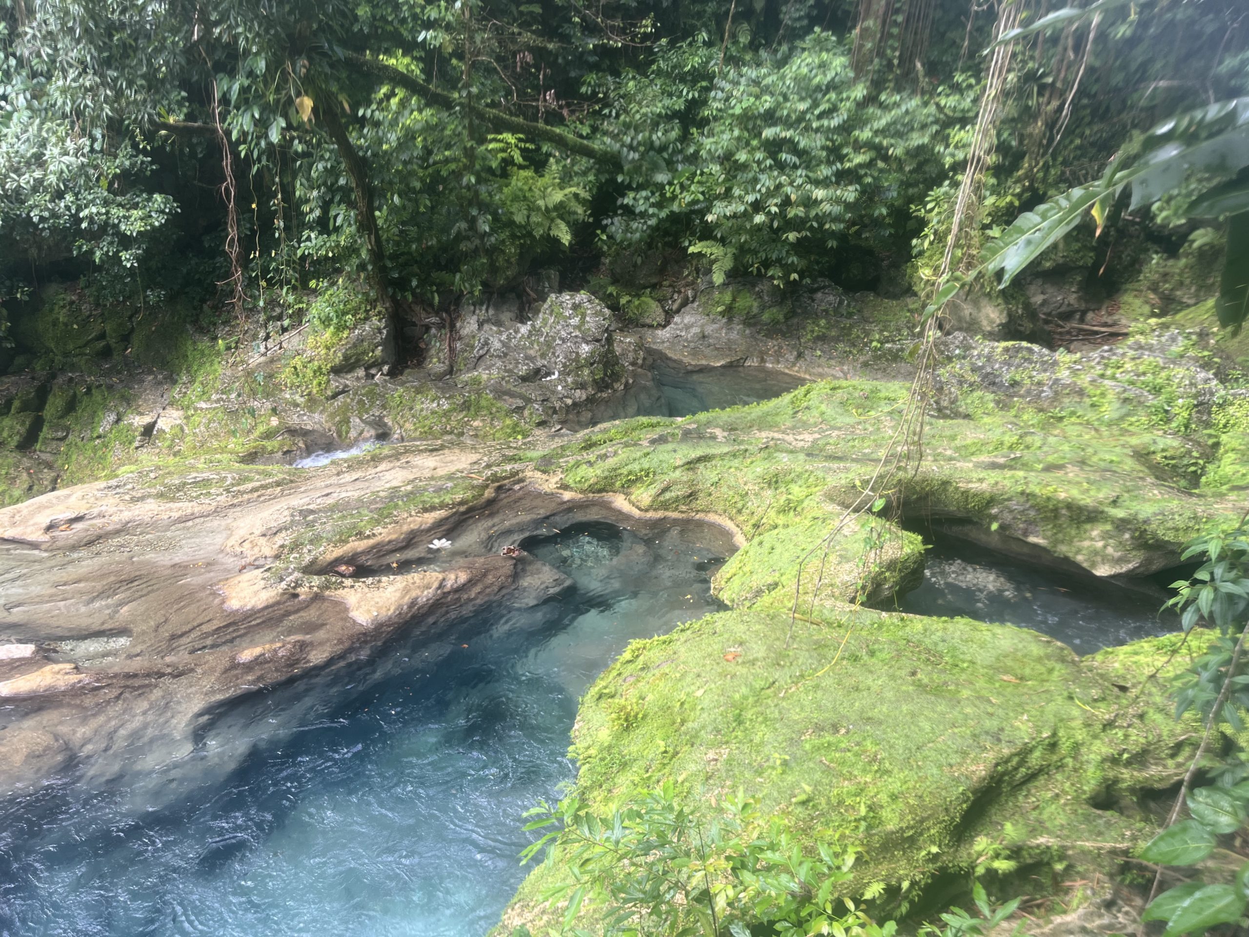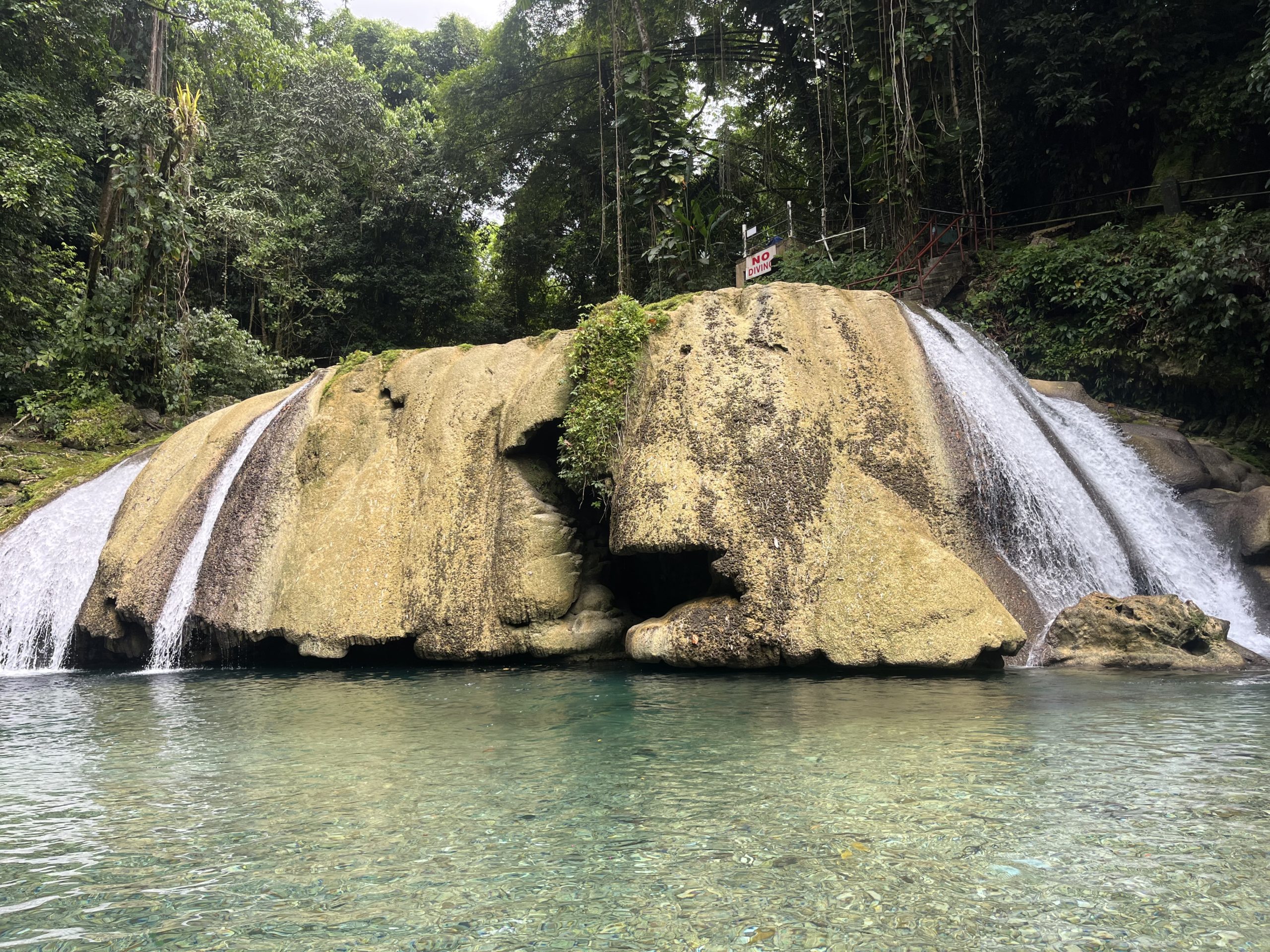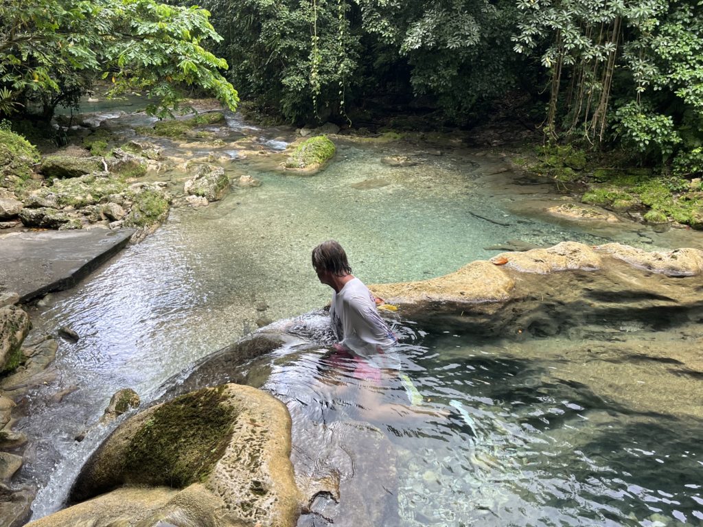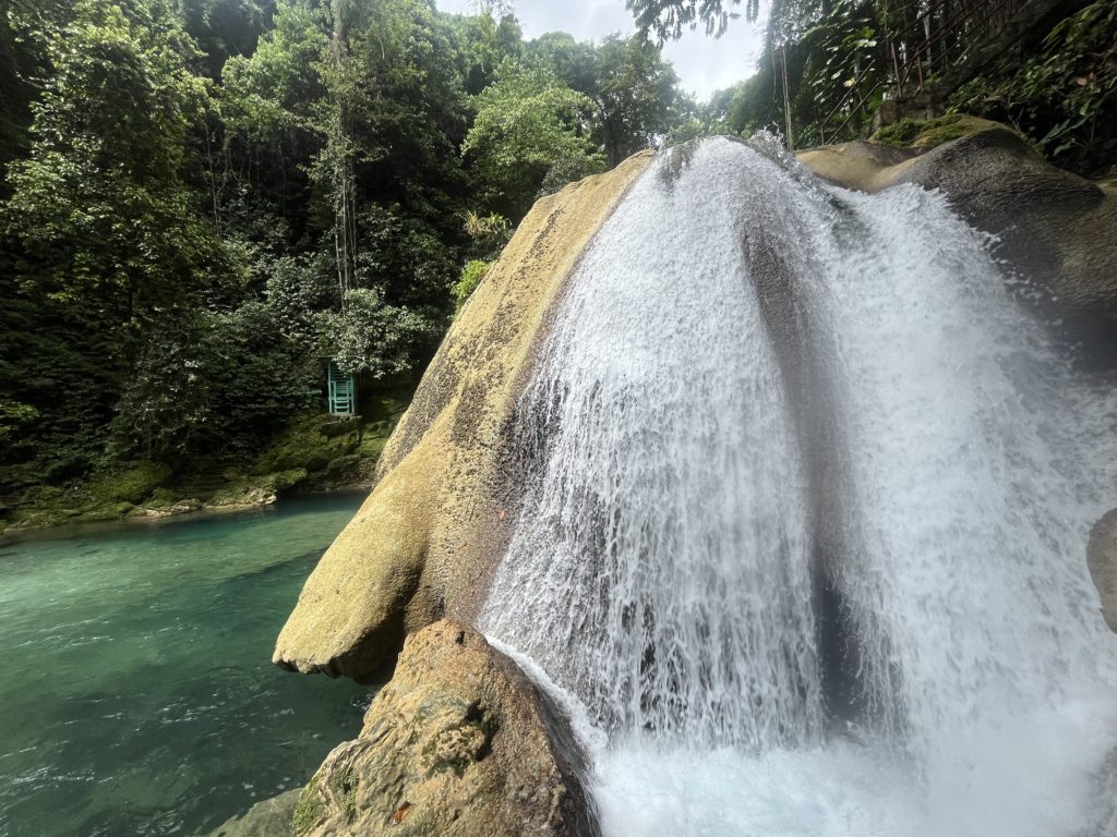Les Reach Falls sont l’un des joyaux naturels les plus spectaculaires et préservés de la Jamaïque. C’est une cascade tropicale au cœur de la forêt luxuriante de la chaîne des John Crow Mountains, alimentée par la rivière Driver’s River. Reach Falls a été découvert par des esclaves en fuite issus de plantations de la paroisse voisine de Saint-Thomas, qui avaient cherché refuge dans les collines des monts John Crow. À notre arrivée ( très tôt le matin bien sûr), la verdure luxuriante de la forêt, les piscines naturelles et la cascade nous enchantent. Nous sommes seuls au monde pour profiter de cet endroit exceptionnel encore très préservé. Un guide (moyennant pourboire) nous propose de remonter dans l’eau, les chutes en passant sous la cascade et sous les grottes naturelles. Quelques petits sauts dans les piscines naturelles quand nous redescendons. Un petit défi sportif qu’on adore. On finit dans le bassin de la cascade principale pour un petit massage au jet naturel!!